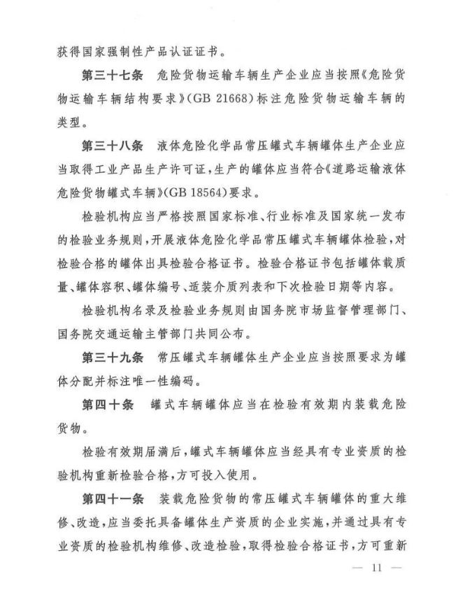 在吸取事故教训、总结各地实践经验、借鉴国际规则的基础上,《办法》对现有危险货物道路运输行业多项制度进行了重大调整和改革,例如:托运清单及运单制度、有限数量及例外数量豁免制度、充装管理制度、常压罐体制造检验制度、车辆承运介质类别管理制度等……