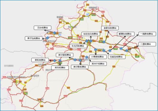 G30线烟墩主线、一碗泉主线、二堡主线、鄯善东匝道、吐峪沟主线、小草湖主线、二十里店匝道、乌拉泊北匝道、头屯河主线、五台主线、奎屯东匝道、奎屯西匝道、果子沟主线,G3003线乌拉泊西主线延安路匝道S116线乌拉泊南匝道,G7线老奇台匝道、米东北主线、甘泉堡匝道,G3012线库米什主线库尔勒主线、库尔楚主线、库车主线、新和主线等收费站