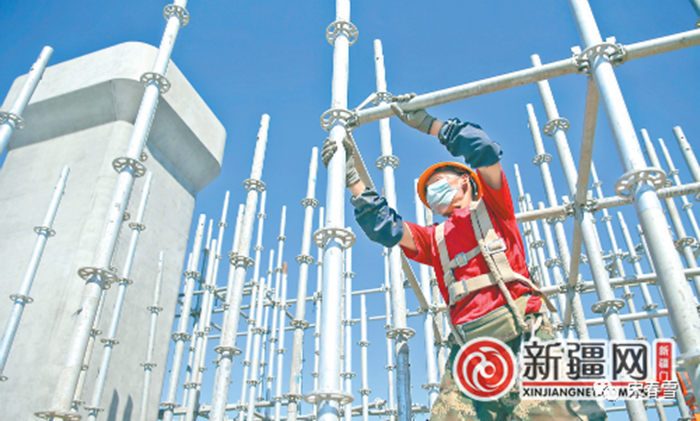 11日,在东进场高架道路工程项目施工现场,工人正在搭建脚手架。(记者蒋晓摄)