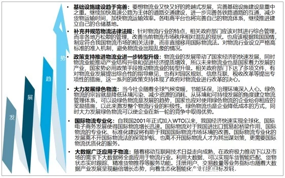 中国物流行业起步较晚,随着国民经济的飞速发展,中国物流行业保持较快增长速度,物流体系不断完善,行业运行日益成熟和规范。具体内容包括以下几个方面:用户服务、需求预测、订单处理、配送、存货控制、运输、仓库管理、工厂和仓库的布局与选址、搬运装卸、采购、包装、情报信息。