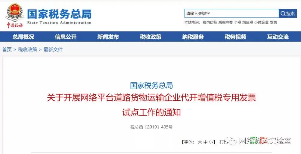 01《国家税务总局关于开展网络平台道路货物运输企业代开增值税专用发票试点工作的通知》 即税总函〔2019〕405号