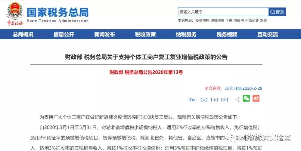 06财政部 税务总局公告2020年第13号 财政部 税务总局关于支持个体工商户复工复业增值税政策的公告