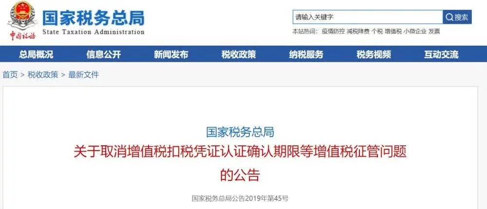 03《国家税务总局关于取消增值税扣税凭证认证确认期限等增值税征管问题的公告》国家税务总局公告2019年第45号
