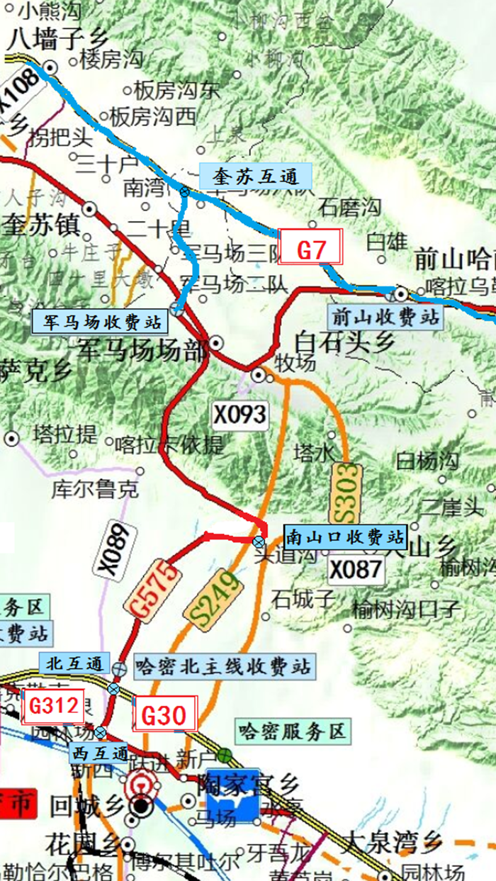 从哈密市区出发驶入G575线,车辆可分别从干线公路及县城互通线路进入。