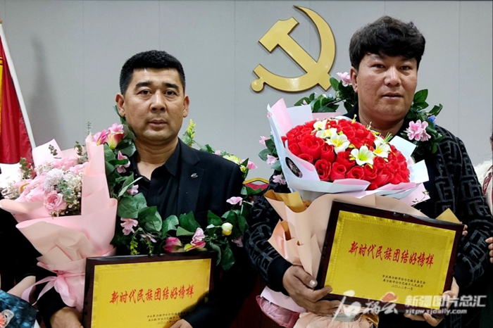 ?1月7日,库尔勒市恰尔巴格乡为买买提·努尔东(左)和曼苏尔·帕塔尔颁发了“新时代民族团结好榜样”奖牌。通讯员 黄万里摄