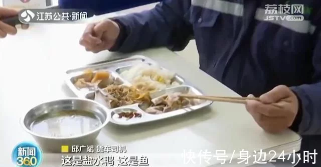 中午时分,很多过路司机都会到“司机之家”餐厅用餐。货车司机邱广斌说:“这是盐水鸭,这是鱼,这是粉丝,还有萝卜,还有汤,免费的。”